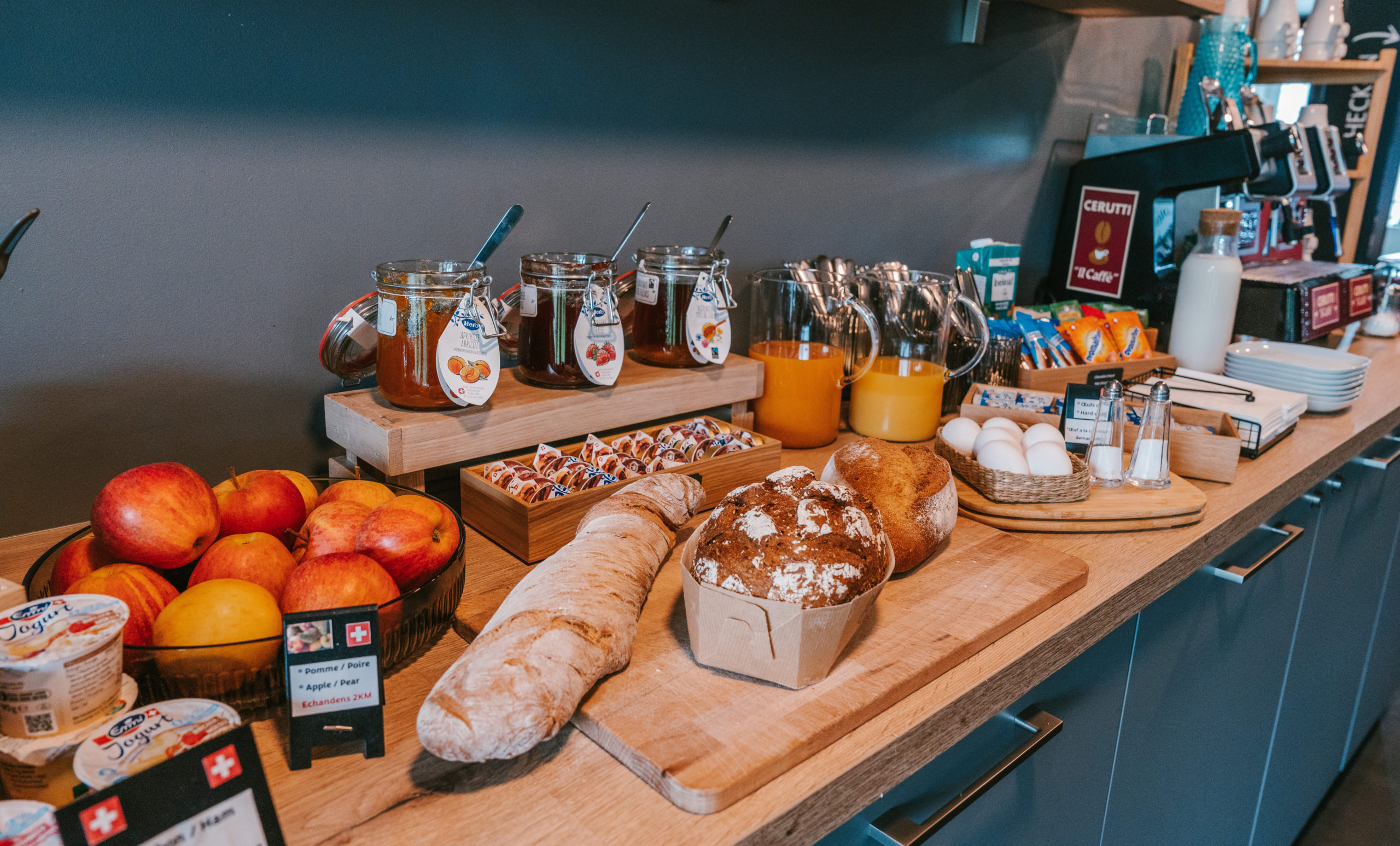 A continental breakfast served buffet-style is offered at the price of CHF 16.- per person per day. A breakfast included option is bookable online. Otherwise, you can add it when checking in.